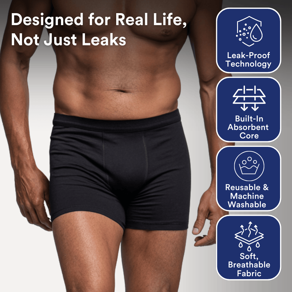 Oenko™ boxer briefs use precision-layered materials designed to lock in leaks, eliminate odor, and stay breathable — all while feeling like regular underwear.