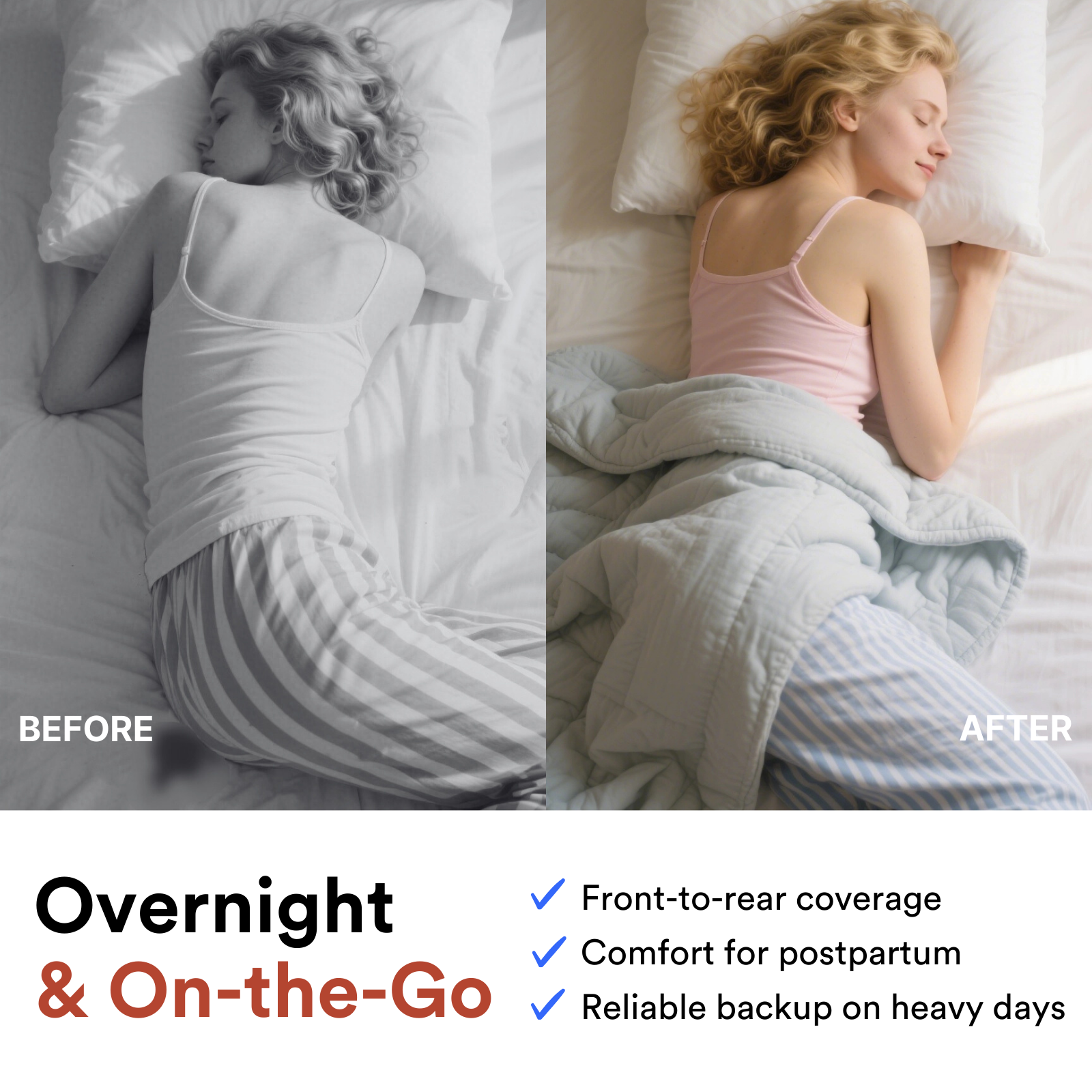 - Use: Light–moderate flow, small daily leaks (laugh, cough, sneeze), postpartum comfort; also works as backup with pads/cups/tampons on heavy nights.